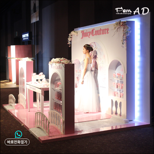 향수 행사부스 쥬시 꾸띄르의 완성된 모습인데요. 이 시기는 봄시즌이라서 그에 맞는 컨셉과 BI 등을 고려하여 제작되었습니다. 팜애드는 이와같은 행사부스제작에 있어서는 업계에서 가장 신뢰할 수 있는 업체 중의 하나라로 평가를 받고 있습니다.