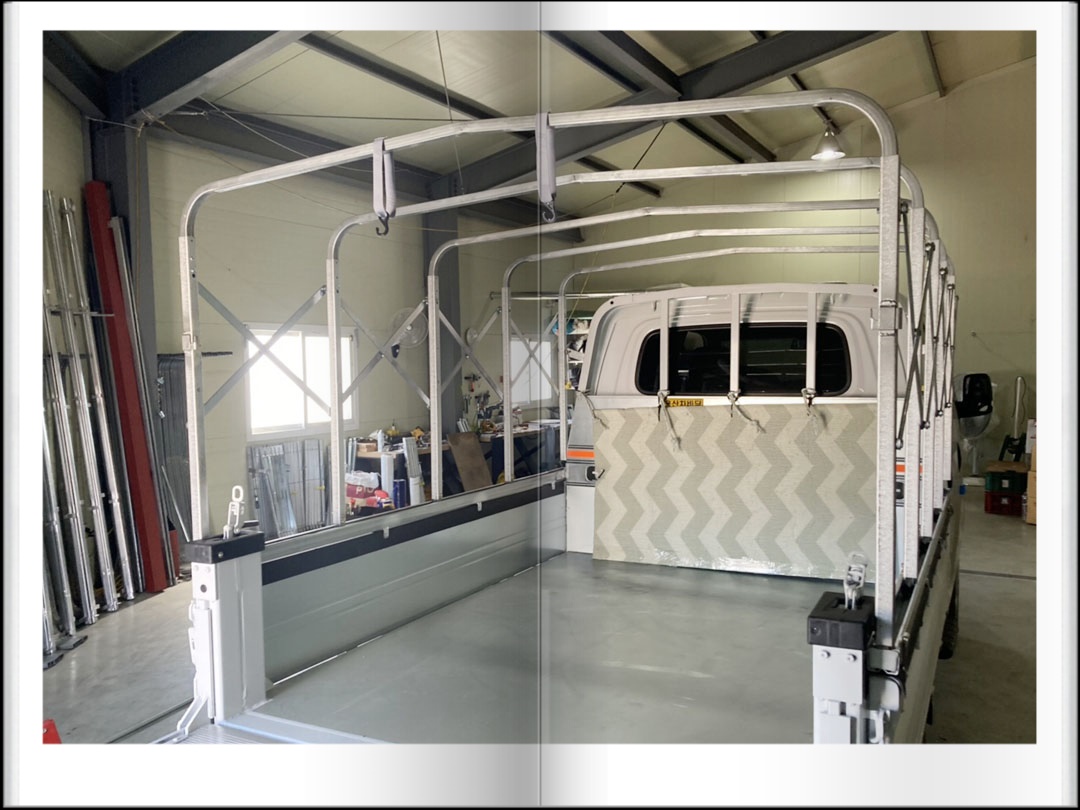 이것이 바로 호루 레일 앞부분의 모습입니다. 또한, 뒷부분도 하나의 일직선상으로 연결하여 설치됩니다. 앞서 말씀드린 것처럼 양쪽 적재함이 개방되는 지점을 정확히 측정하여 앞부분과 뒷부분이 단락된 상태로 하나로 연결되고, 적재함과 호루 레일 사이에 약간의 틈새가 있는 것을 확인할 수 있는데요. 이 사이로 깔깔이나 고무바를 넣어 적재물을 고정 및 결박시킬 수 있습니다. 또한, 적재물을 고정시켜도 호루를 펼치고 접고 하는 작업이 가능한 것은 호루 레일 위에 슬라이딩 자바라가 올려지기 때문이죠.