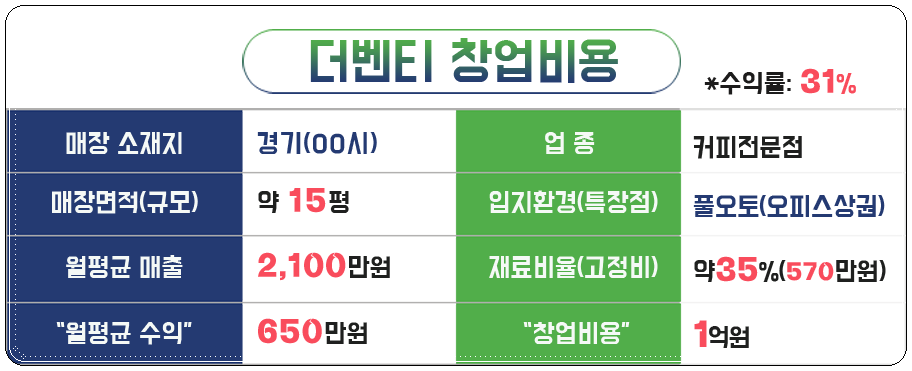 위의 표에서는 더벤티창업비용, 매장현황, 입지환경, 월별실적 등을 한눈에 확인해볼 수 있도록 잘 요약되어 있습니다. 그동안 정말 궁금했던 것에 대한 응답일지도 모릅니다. 이것은 현장의 목소리와 상황을 고스란히 담고 있기 때문이죠. 부분적으로 나눠서 살펴보면 다음과 같습니다.