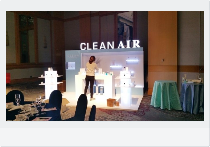 행사부스제작을 위해서는 수차례의 담당자와 기획회의, 설계, 디자인, 제작 등의 절차를 통해서 최종적으로 완성하게 되는데요. 클린 향수의 특별한 제품을 더욱 돋보이게 하기 위하여 조명, 목재, 철재 등의 장인들이 총출동하여 팜애드 공장에서 설계안 대로 파츠로 제작하고 이것을 현장으로 이송해서 사진처럼 조립하여 완성하게 됩니다.