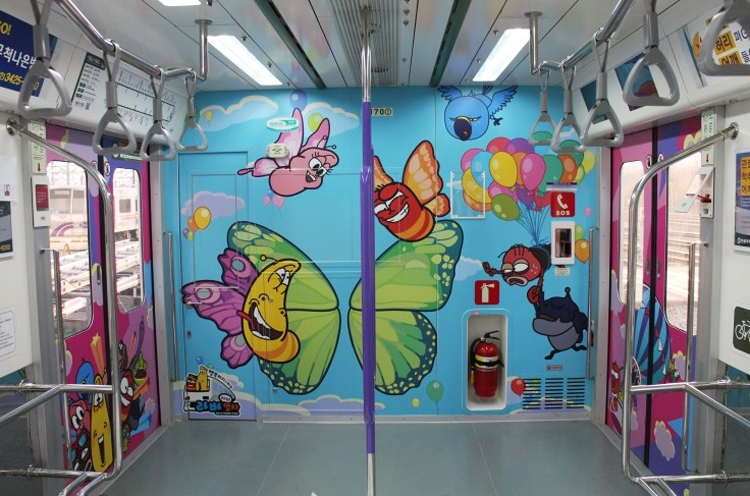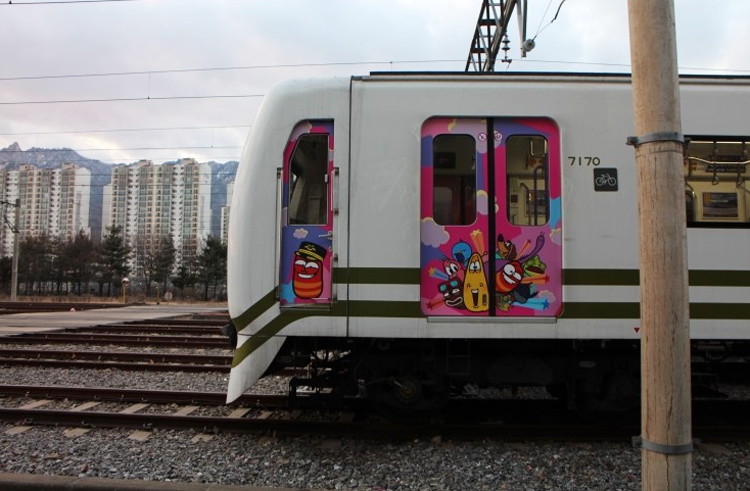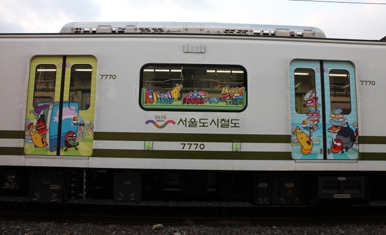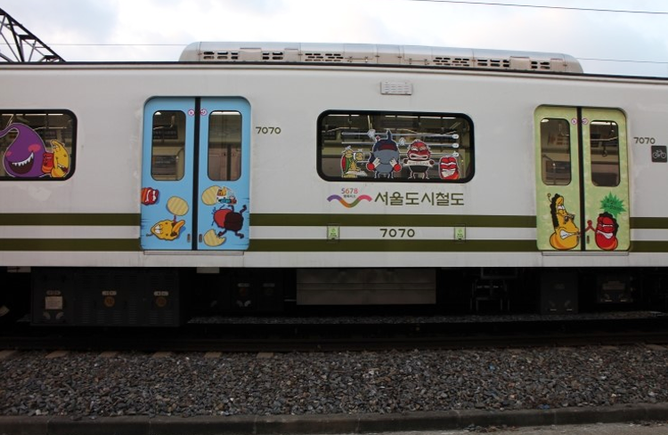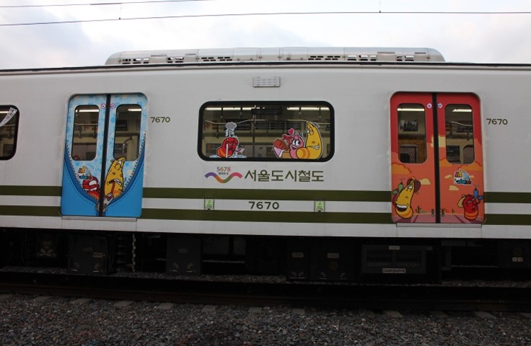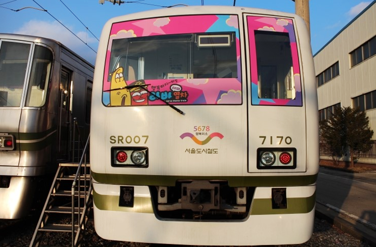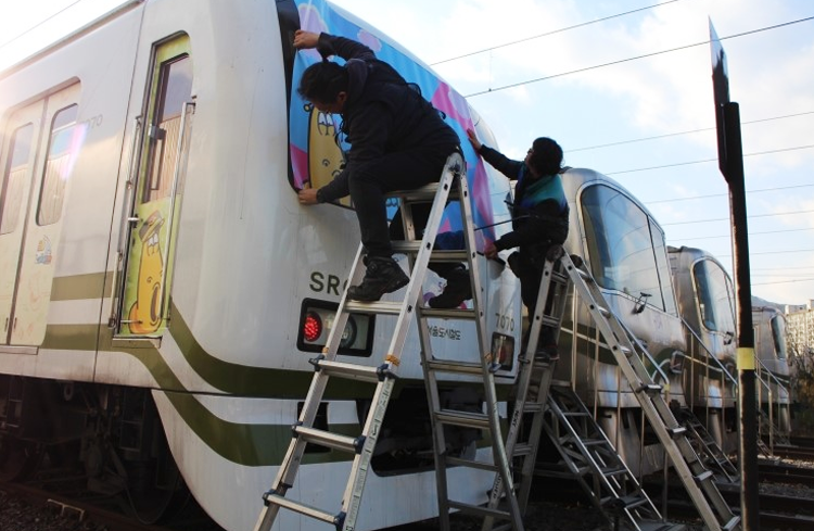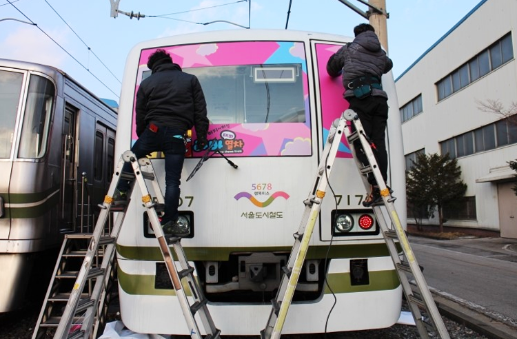 안녕하세요! 오늘은 지하철광고 중에서 랩핑광고로 진행된 7호선 라바 랩핑 사례를 살펴봅니다. 팜애드의 현장 설치팀이 7호선 전동차에 랩핑작업을 하고 있는 모습입니다.