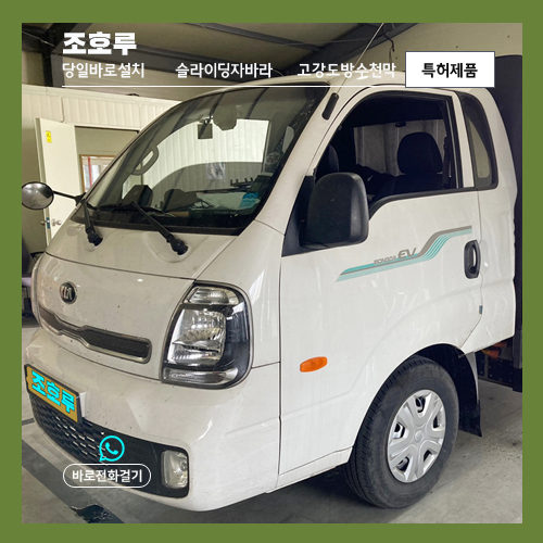 안녕하세요! 오늘은 조호루에서 1톤 호루 제작한 사례를 보여 드릴께요. 사진은 1톤 봉고3 전기차의 모습이죠. 요즘은, 많은 차주분들께서 경제성을 고려하여 전기 차종으로 전환하는 추세인 것 같습니다. 조호루 내방 시 포터, 봉고 호루 제작 시 전기차들이 많이 오고 있네요. 기존 호루를 제거하고 새로운 호루를 설치하거나 첫 설치를 하려고 오시는 분들이 대부분입니다.