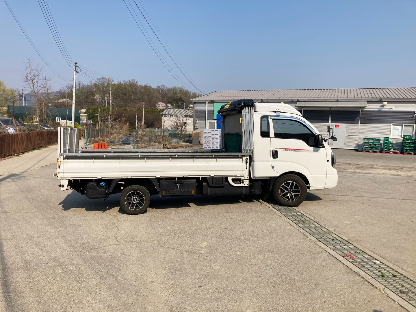측면에서 촬영한 봉고3 초장축 호루의 모습이에요. 1톤 호루에서는 몇가지 신경을 써서 설치해드려야 하는 차량별 옵션이 있는데요. 킹캡, 더블캡, 초장축, 리프트 등의 특수한 차량들은 그만큼 호루 이동로인 레일을 특정하고 그에 맞는 완벽 방수천막과 저소음 프레임이라 불리는 슬라이딩 자바라를 맞춤으로 제작하여 설치해야 하는 것이죠.