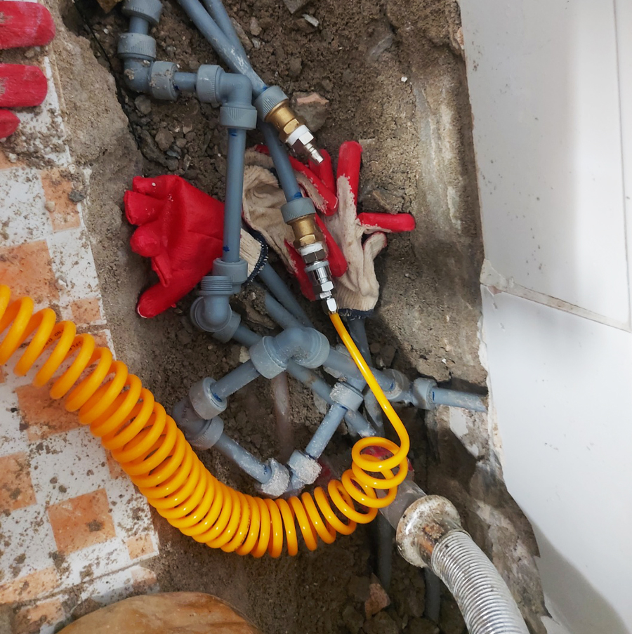 (1)공압테스트를 해보니 압력게이지가 떨어지는 것을 확인했습니다. 누수량을 비교하면서 테스트를 진행하였고 정밀 누수탐지를 통해서 누수원인과 특정위치를 파악할 수 있었습니다. 수도배관이 얕게 매립되어 있는 배관이라서 비교적 찾기는 쉬웠고 좁은 곳에서 새어나오는 것도 확인했습니다.