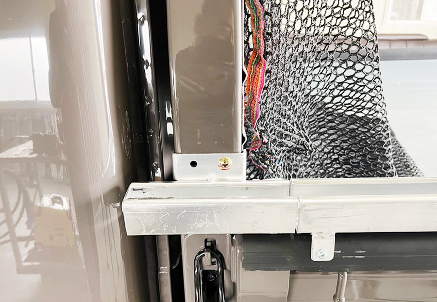 1톤 호루, 접이식은, 자바라(주름진)의 뜻을 가장 잘 표현한 용여가 아닐까 싶은데요. 적재물이 없는 경우는 사진처럼 슬라이딩 자바라를 앞쪽으로 이동시켜 고정해주면 됩니다. 양쪽에 고정손잡이가 있어 돌려서 고정시켜주고 풀면 다시 호루 왕복이 가능합니다. 깔깔이 치는 작업 등 호루 설치 이전에 모든 활동이 가능합니다.