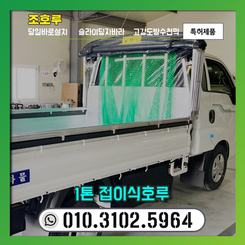 안녕하세요! 오늘은 조호루에서 제작 및 설치한 1톤 접이식 호루 제작 사례를 보여드릴께요. 1톤 호루는 주로 포터트럭, 봉고트럭을 중심으로 하고 있지만, 맞춤형 설치가 가능해서 화물차종이면 호루 설치가 가능합니다. 특허제품 호루라서 설치 즉시 업무효율성과 안정성을 경험할 수 있습니다.