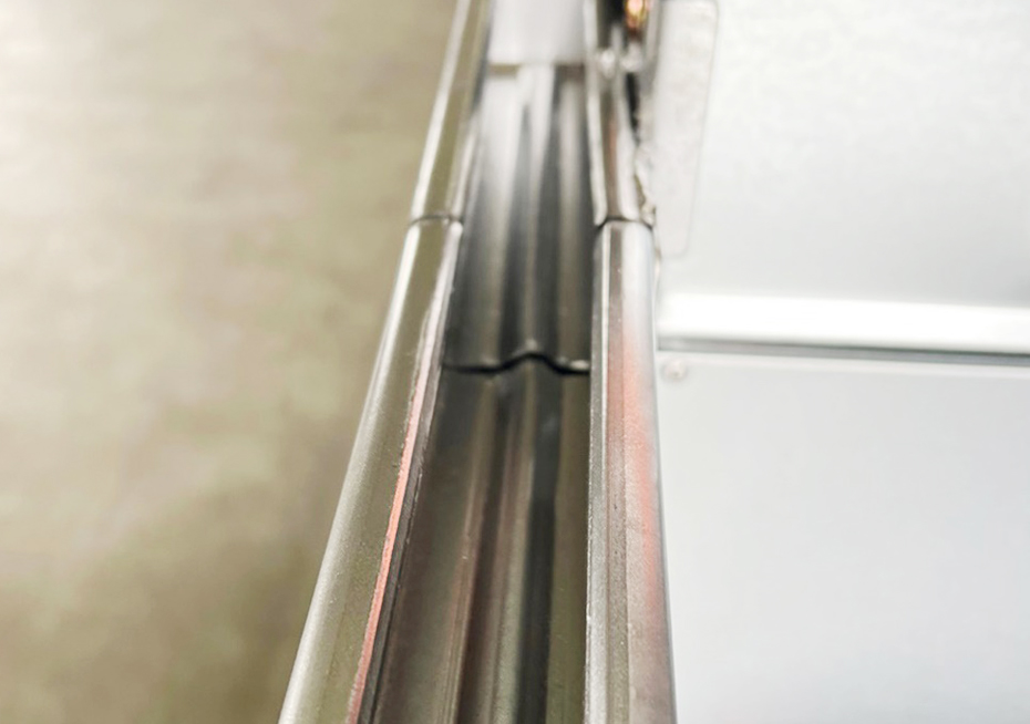 1단계가 끝났다면, 이제는 특허제품을 올려주는 2단계 슬라이딩 자바라 설치로 이어집니다. 저소음 프레임은 아연도금 강철 재질로 녹이슬지 않고 내구성과 내열성이 우수합니다. 그만큼 오랜동안 안전하게 사용이 가능하다는 것이죠. 또한, X살대 등 각 이음새 부분에는 풀림방지 너트가 적용되어 안전하게 운영이 가능합니다.