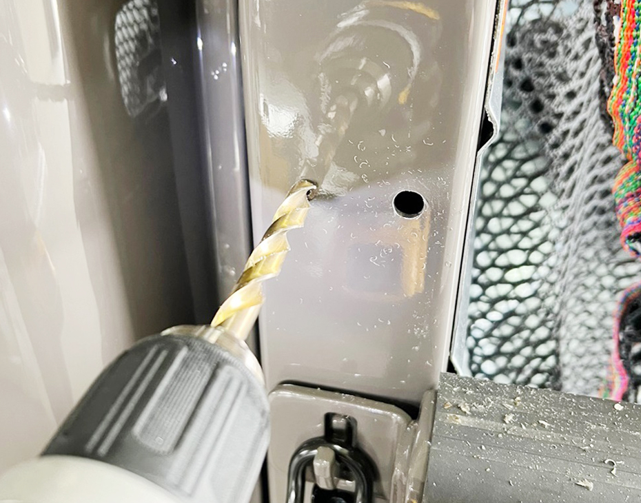 안녕하세요! 오늘은 조호루에서 설치해드린 1톤 적재함 호루 설치사례를 보여드릴께요. 적재함 호루는 적재함 상단부에 호루를 설치해서 붙여진 이름이고 포터, 봉고트럭 위주로 설치된다고 해서 트럭호루라고 부르기도 합니다. 사진은, 호루 이동로(레일) 설치를 위한 밑작업으로 위치를 특정하고 드릴작업을 진행합니다.