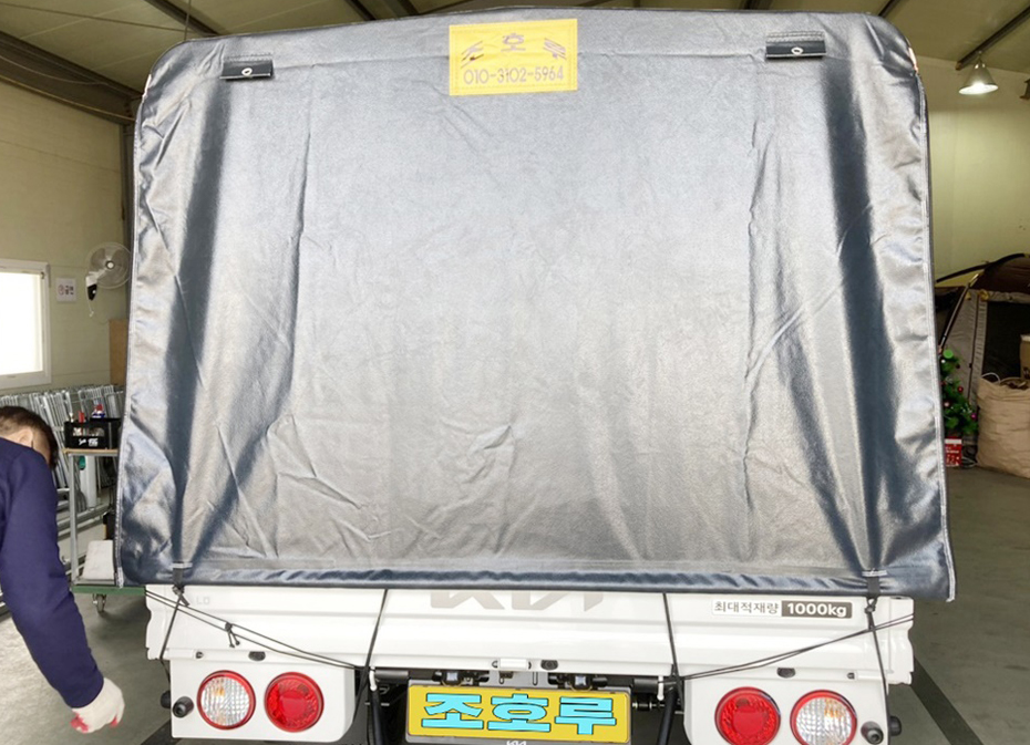 3단계에서는 고강도 방수천막을 설치합니다. 이 천막은 특수재질로 제작되며 국내 모든 기후의 영향으로부터 내부 적재물을 보호, 보존시켜주고 영하 30도에서도 부드러운 움직임, 호루 왕복이 가능하도록 합니다. 마감부분에는 파이프재질로 되어 있어 양쪽 갑바를 말아올리고 내릴 때 편리합니다.