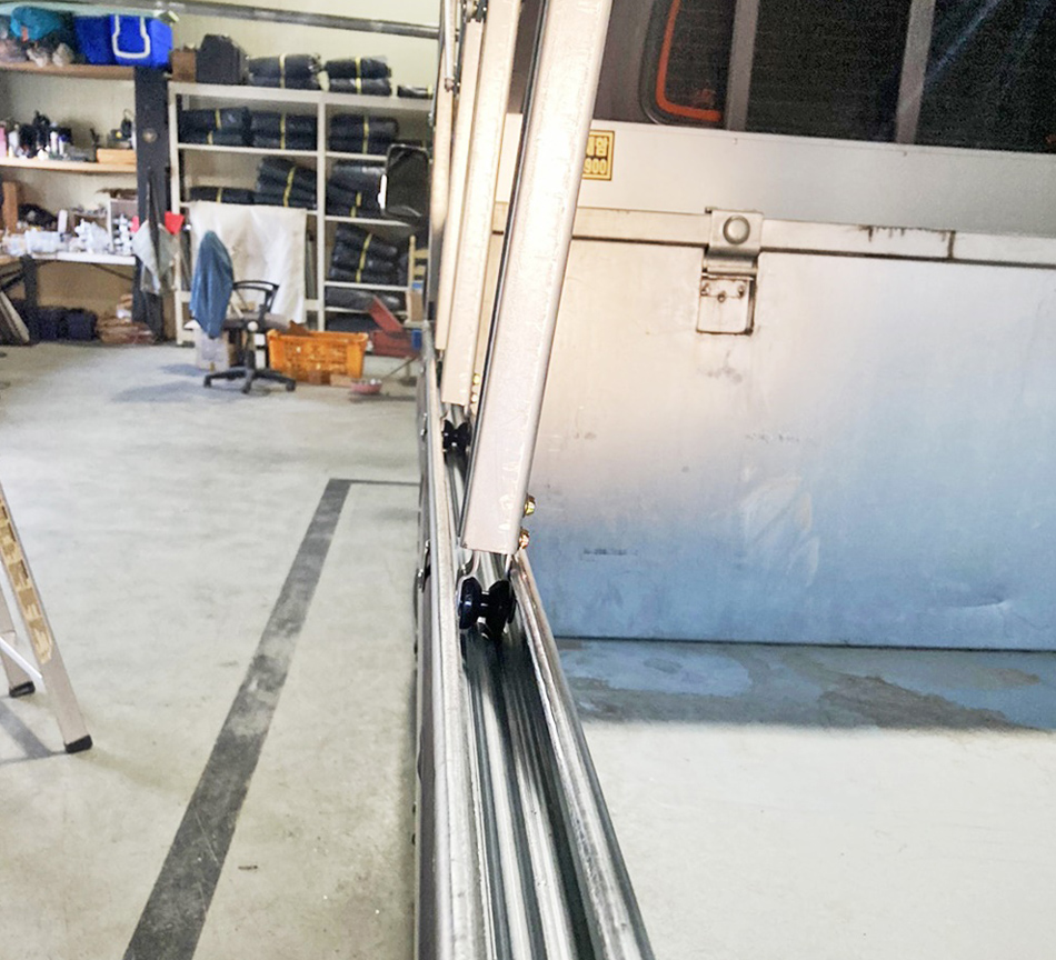 1톤 자바라호루 설치의 첫시작은 역시나 호루왕복을 원활하게 해주는 호루 이동로 즉, 호루 레일을 설치하면서 시작됩니다. 양쪽 적재함 상단부에 자바라호루 이동로를 설치합니다. 적재함과 이동로 사이에는 약간의 틈새를 주고 그 사이로 깔깔이 치는 작업이 가능하도록 해줍니다. 호루 이동로는 앞부분과 뒷부분을 단락된 형태로 설치하여 양쪽 적재함 개방이 가능하도록 합니다.