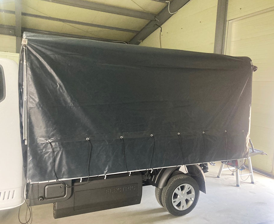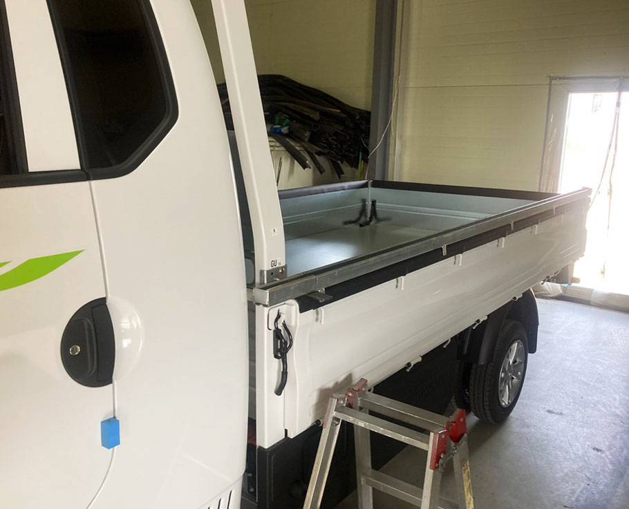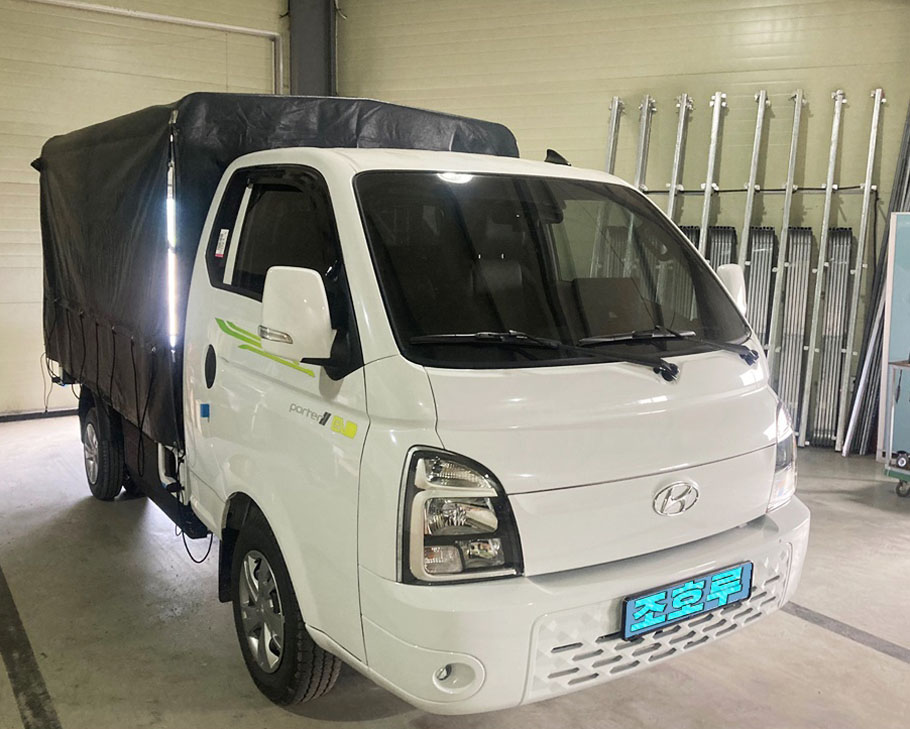 1톤 포터2 전기차 호루의 완성된 모습이죠. 이 사진의 좌우측 적재함 상단부에 설치된 호루 이동로 내부 바닥면을 보시면 앞선 설명처럼 바닥면이 평평하지 굴곡진 레일이 형성되어 있다는 것을 확인할 수 있습니다. 이 레일로 인해 균등한 마찰력을 형성하여 한번의 푸시만으로도 끝까지 밀려나갈 수 있습니다. 그만큼 업무효율성을 확보할 수 있다는 것이죠.