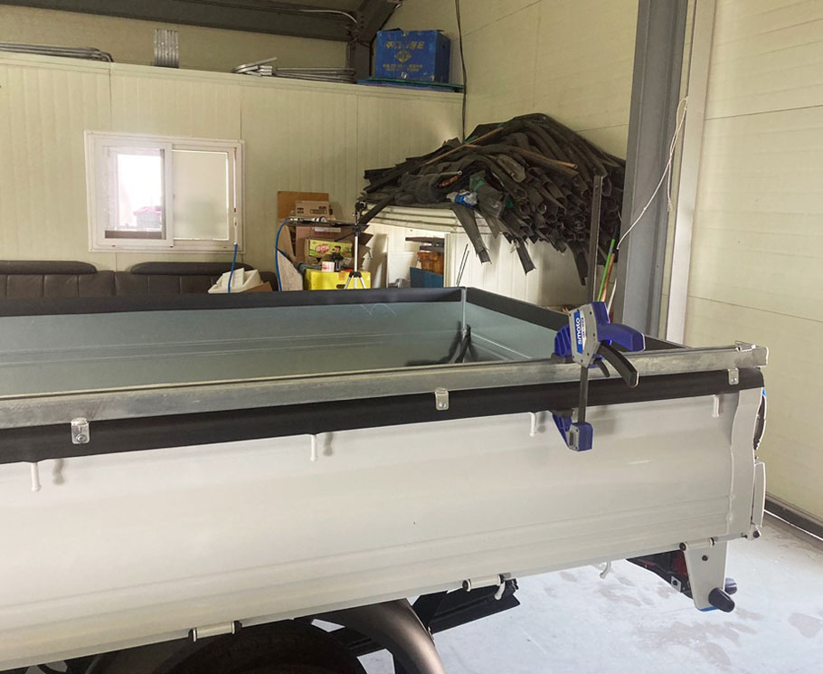 1톤 호루 즉, 포터2 전기차 호루 설치는 호루 이동로 설치부터 시작하여 슬라이딩 자바라, 고강도 방수천막 설치 순으로 마무됩니다. 사진은, 호루 이동로(레일)를 설치하고 있는 모습이죠. 양쪽 적재함 상단부에 설치하고 이동로 바닥은 평평하지 않고 굴곡진 레일이 형성되어 이 위에 올려지는 슬라이딩 자바라 우레탄바퀴가 안착되어 부드러운 왕복이 가능합니다. 깔깔이 치는 작업도 가능하도록 약간의 틈새를 주었습니다.