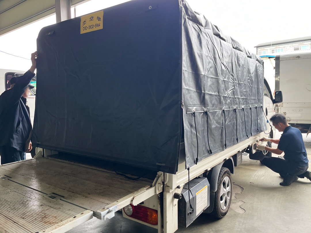 고강도 방수천막은 사진처럼 기존에 복잡한 로프나 고정끈이 사라지고 간편하게 줄을 땡겨서 고정하고 다시 풀어서 빠르게 호루를 접고 상차나 하차를 진행할 수 있어요. 특수재질로 제작되는 방수천막은 변색이 덜하고 영하 30도에서도 얼지 않고 부드러운 움직임이 가능해요. 마감부분에는 파이프 재질로 제작되어 빠르게 말아올리거나 내릴 수 있습니다.